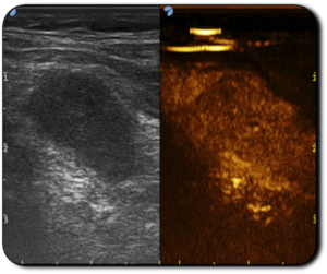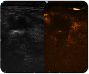 Immagine CEUS che evidenzia l’elevato assorbimento del contrasto del linfonodo patologico