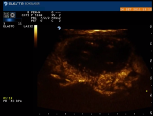 Immagine CEUS post trattamento che evidenzia l’area ipoecogena della zona di coagulazione