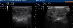 Immagini ecografiche pre trattamento e a due anni di follow-up in cui si evidenzia la riduzione del nodulo