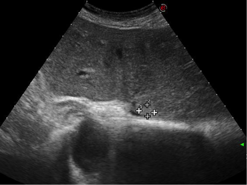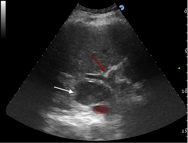 Un paziente con lesione epatica (freccia bianca in Figura), parzialmente esofitica, posizionata tra un ramo della vena porta e la vena cava, è stato sottoposto a Termoablazione con EchoLaser, utilizzando 4 fibre due posizionate nella parte superiore della vena porta e due nella parte inferiore. La lesione, particolarmente difficile da trattare per gli elementi vascolari che la circondano, è stata ablata completamente senza alterazione delle strutture vascolari circostanti.
