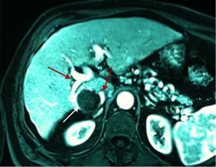 Immagine RM ad 1 mese dal trattamento che mostra una completa ablazione (freccia bianca)