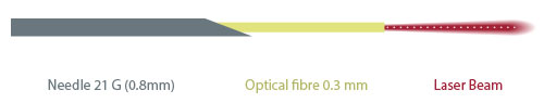 This is all thanks to the combined action of an encrease of the local temperature and exposure time. The interaction of the laser radiation with a 1064nm wavelength (within the range of the therapeutic window) provided by ECHOLASER is excellent, offering low radiation absorption and excellent light penetration. The laser light is conveyed by the source to the tissues through extremely flexible quartz optical fibres with a small diameter (300 micron) and a flat tip, which are inserted percutaneously with fine needles (21 Gauge).